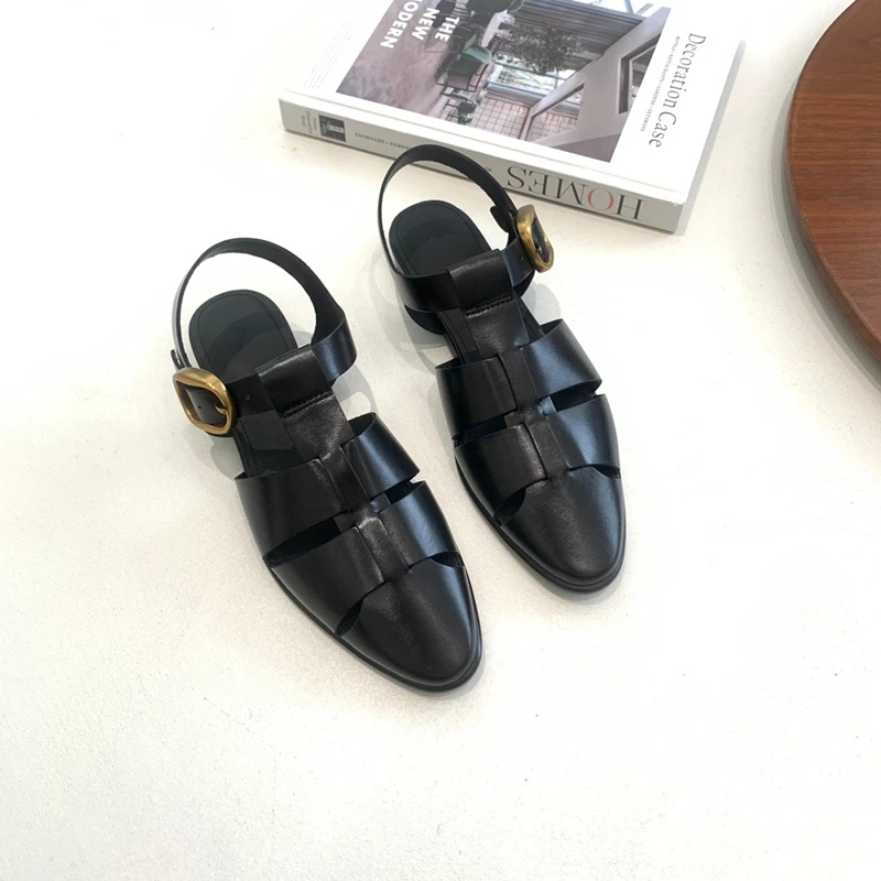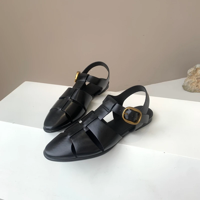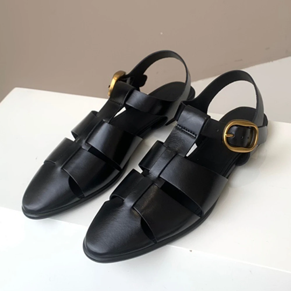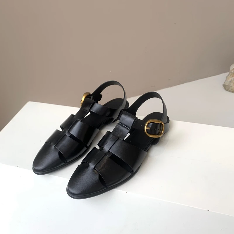 Genuine Leather Comfortable Pointed Toe Flat Sandals Women Fashion Ladies Summer Retro Hollow Roman Sandals